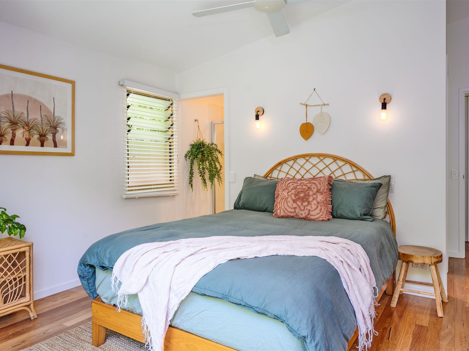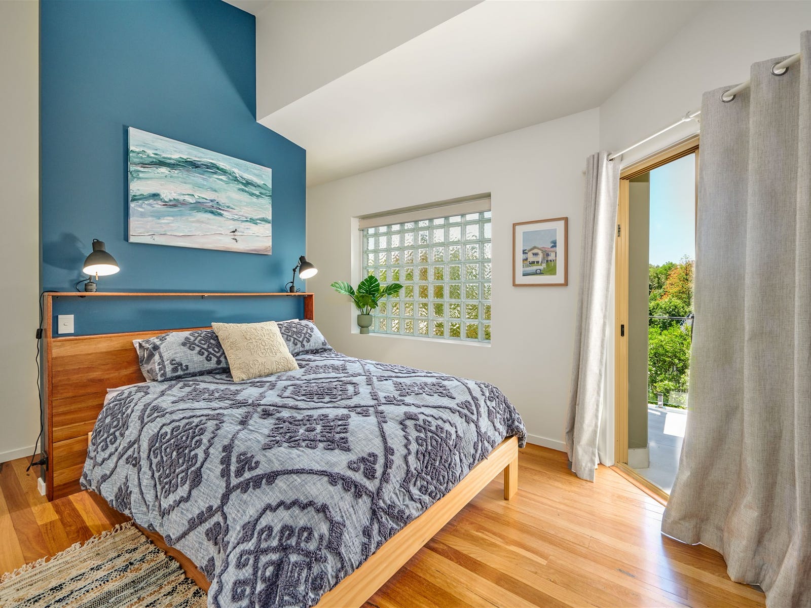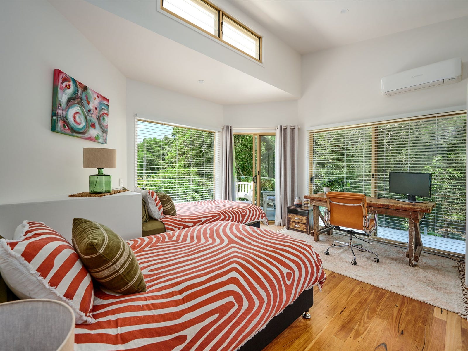 Upstairs are three beautifully appointed bedrooms all with deck access and amazing outlooks over the forest, pool and community park. It has two bathrooms including a large bath in one, and a separate laundry with washing machine and dryer. There are two queen beds plus two king singles. One bedroom includes a well-appointed desk with a second monitor and strong wifi signal throughout the home, so you can stay comfortably connected to the office while living at the beach.