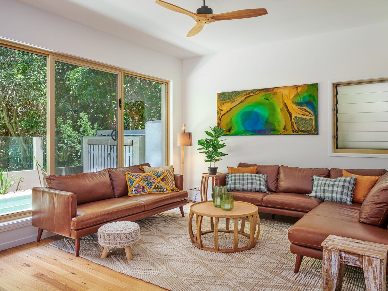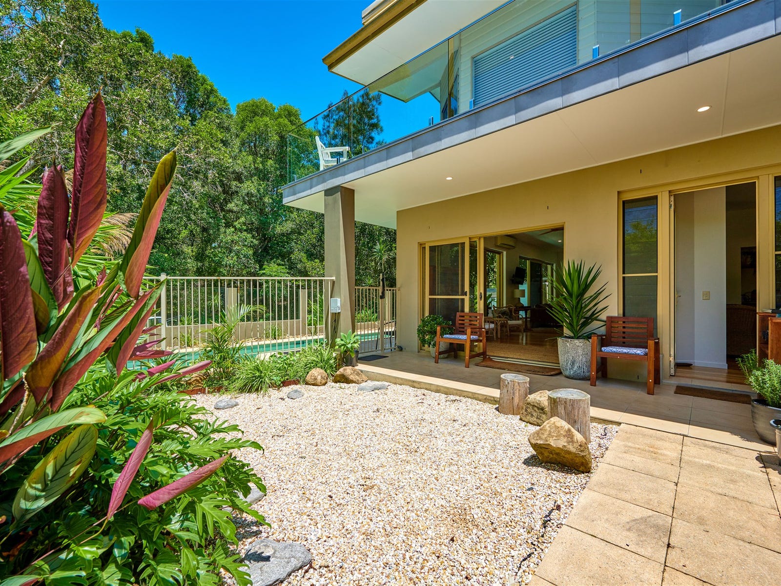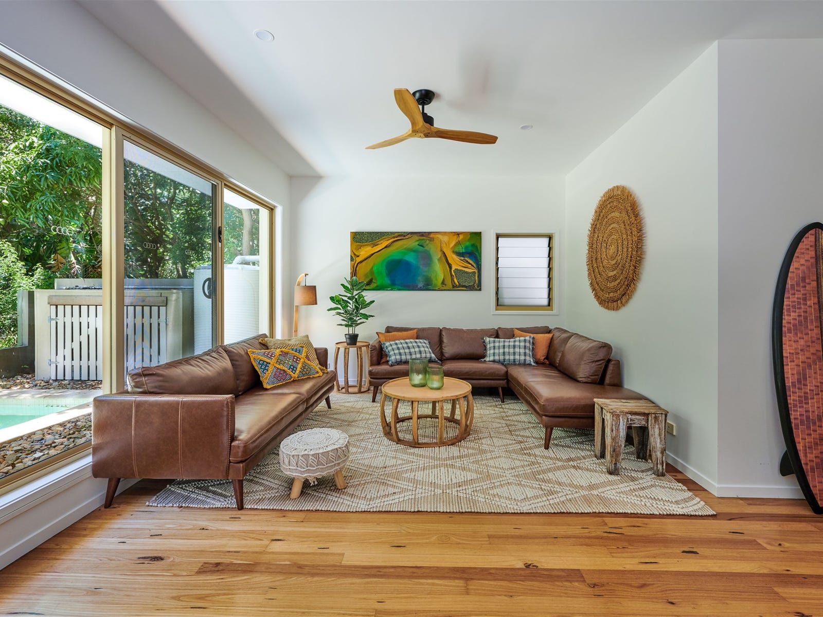 With high ceilings, luxury furnishings and a forest outlook, you'll feel right at home here. Downstairs encompasses a large kitchen, living and dining open area plus tea/coffee/wine bar, surrounded by the pool and a barbeque area with landscaped courtyard. There's also access to your private picnic table and play space, an accessible toilet, outdoor shower and undercover surfboard/beach gear storage area.