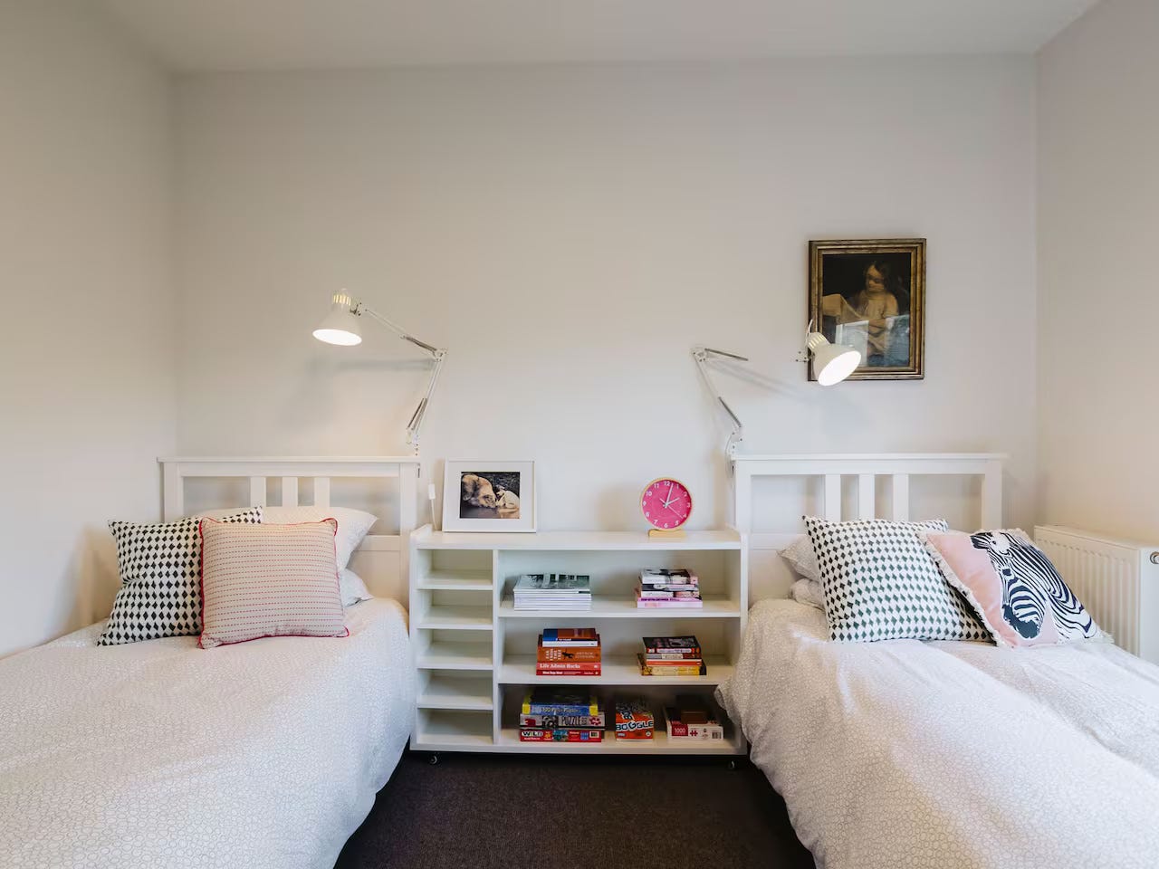 Bedroom 4: Ideal for children or extra guests, this bedroom features two single beds, generous closet space, bedside lamps, and lots of natural sunlight, making it a cheerful and relaxing space.