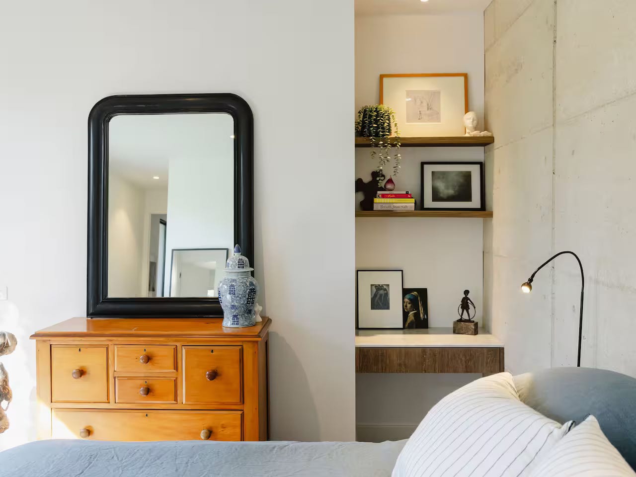 Bedroom 1: Featuring a luxurious king bed, bedside tables with elegant lamps, a desk, a set of drawers, and a portable hanging rack with coat hangers. This room also includes a private ensuite bathroom adorned with stylish marble finishes, offering a true retreat experience.